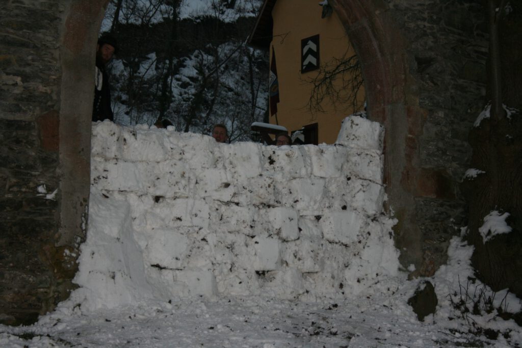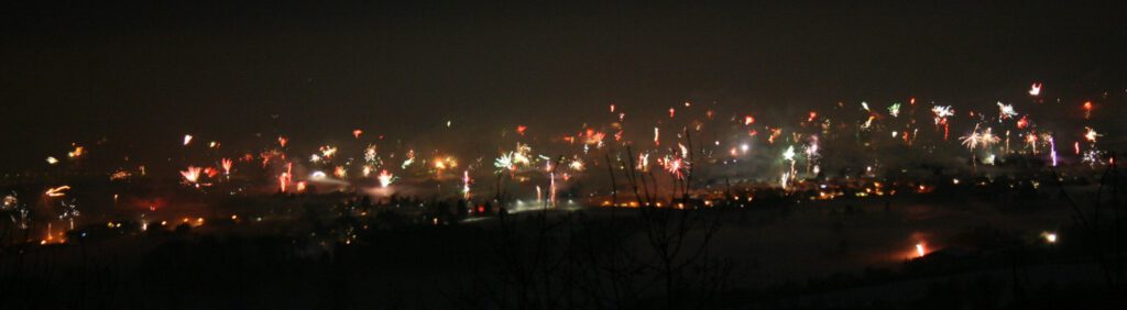 Es wird gemeinsam musiziert, gesungen und vor allem sehr gut gegessen. Kurz vor Mitternacht finden sich alle schweigend mit Fackeln zusammen und erklimmen die Ruinen der Burg. Dort bildet sich eine Runde und gemeinsam ein Feuer entzündet. Nach einer Ansprache mit viel Theatralik und Romantik kann dann pünktlich um Mitternacht das Feuerwerk in der Umgebung aus einer gänzlich anderen Perspektive betrachtet werden: von Oben und aus der Ferne – denn knallen ist auf der Burg verboten!